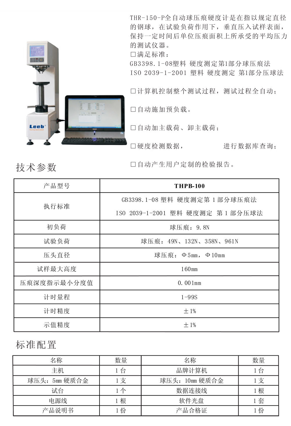 THPB-100全自動球壓痕硬度計是在指以規(guī)定直徑的鋼球,在試驗負荷作用下,垂直壓入試樣表面,保持一定時間后單位壓痕面積上所承受的平均壓力的測試儀器。