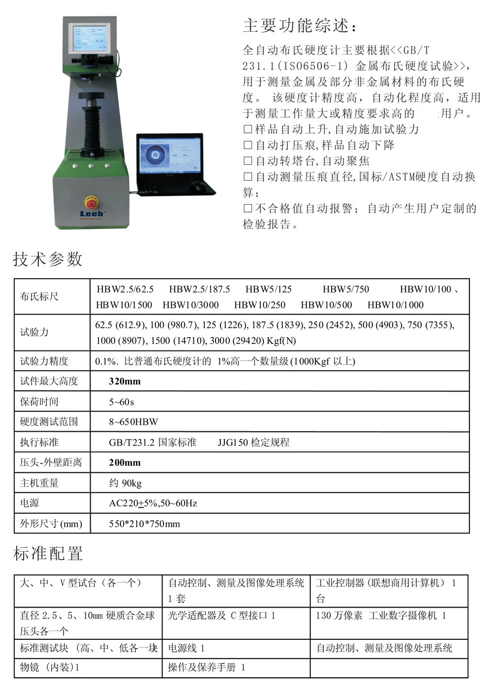 全自動布氏硬度計主要根據(jù)《GB/T231.1(ISO6506-1)金屬布氏硬度試驗》,用于測量金屬及部分非金屬材料的布氏硬度。該硬度計精度高,自動化程度高,適用于測量工作大或精度要求高的用戶。