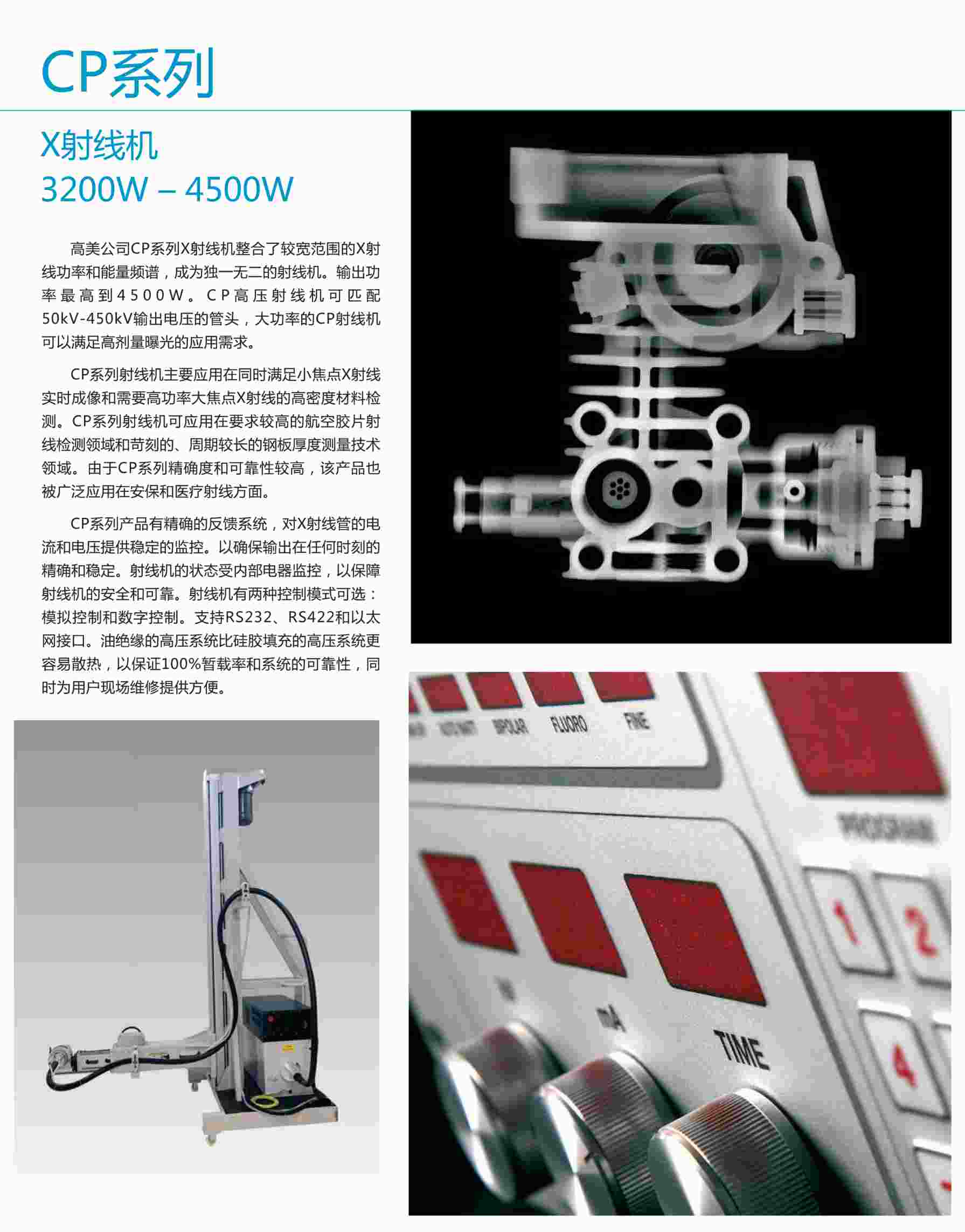 高美公司的CP系列射線機(jī)整合了較寬范圍的X射線功率和能量頻譜,成為特有的射線機(jī)。輸出功率最高到4500W。CP高壓射線機(jī)可匹配50kv-450kv輸出電壓的管頭,大功率的CP射線機(jī)可以滿足高劑量曝光的應(yīng)用需求。