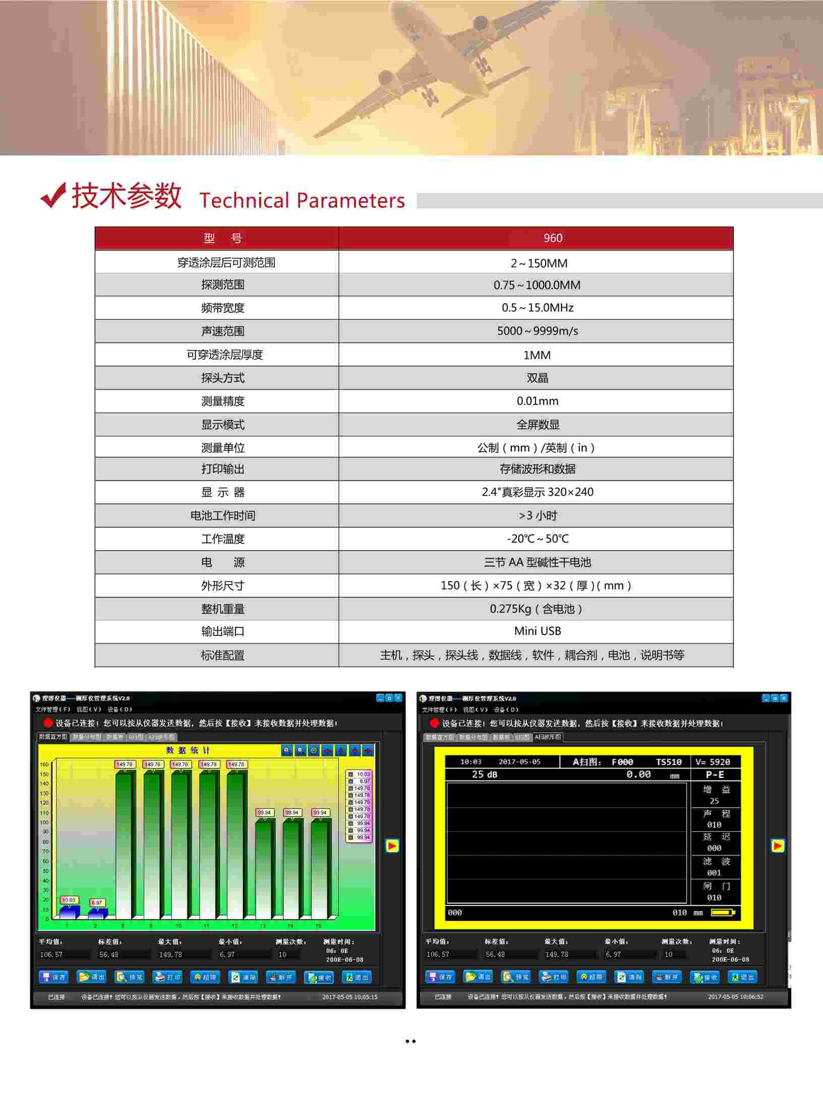 ● 專業(yè)的數(shù)據(jù)處理軟件,基于Windows的Uee?960接口程序用于收集、創(chuàng)建、打印及管理來自Uee?960測厚儀的數(shù)據(jù)。顯示數(shù)據(jù)集和測量總結(jié)文件,文件包含厚度讀數(shù)、測厚儀設(shè)置值及探頭設(shè)置值,AScan波形和BScan圖形。