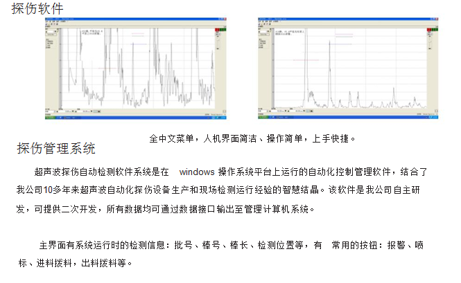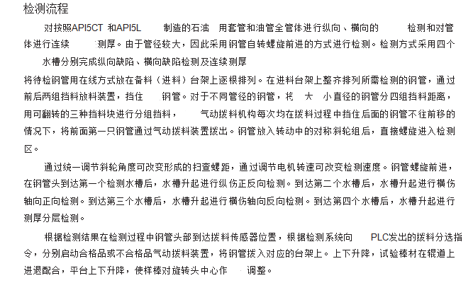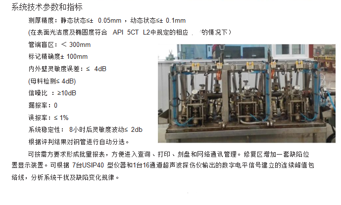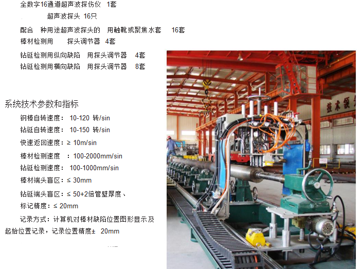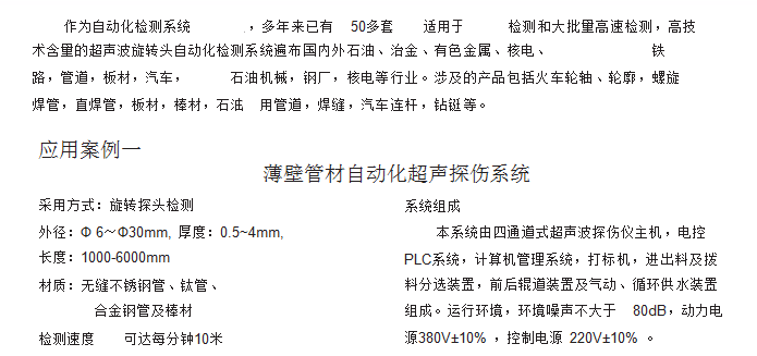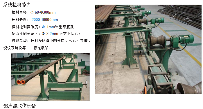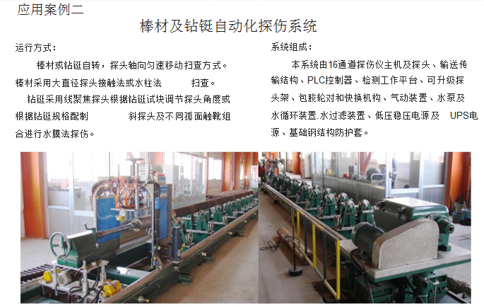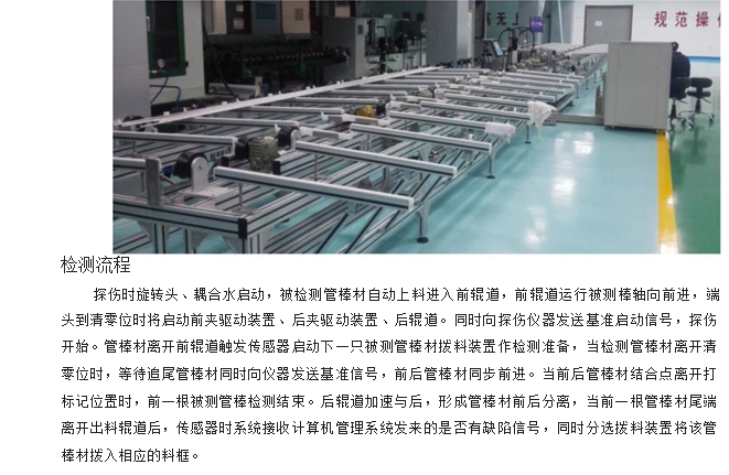 利用:龍門架將探傷主機及探頭固定,探頭位于龍門架正下方,并依附于龍門架可左右移動,被測工件通過下方的導輪虛轉式前進,通過調節(jié)探頭的高度及夾角可以對不同管徑及厚度的管材探傷。