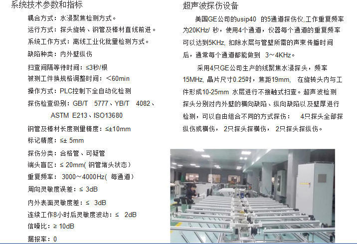 工作方式:超聲波探頭高速旋轉,工件勻速前進,則頭與工件非接觸,利用循環(huán)水形成的水膜進行耦合探傷。適合較小的圓管及棒材.
