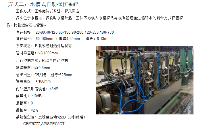 工作方式:工件旋轉式前進,探頭固定探頭位于水槽內,探傷時水禮升起,工件下方侵入水槽探頭與彼測管泊通過循環(huán)水的耦合方式掃查探傷。比較適合石油管道。
