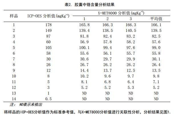 從圖1可以看出,采用手持式XRF X-MET8000儀器能準確分析膠囊中的鉻元素含量,能夠?qū)崿F(xiàn)現(xiàn)場篩選。