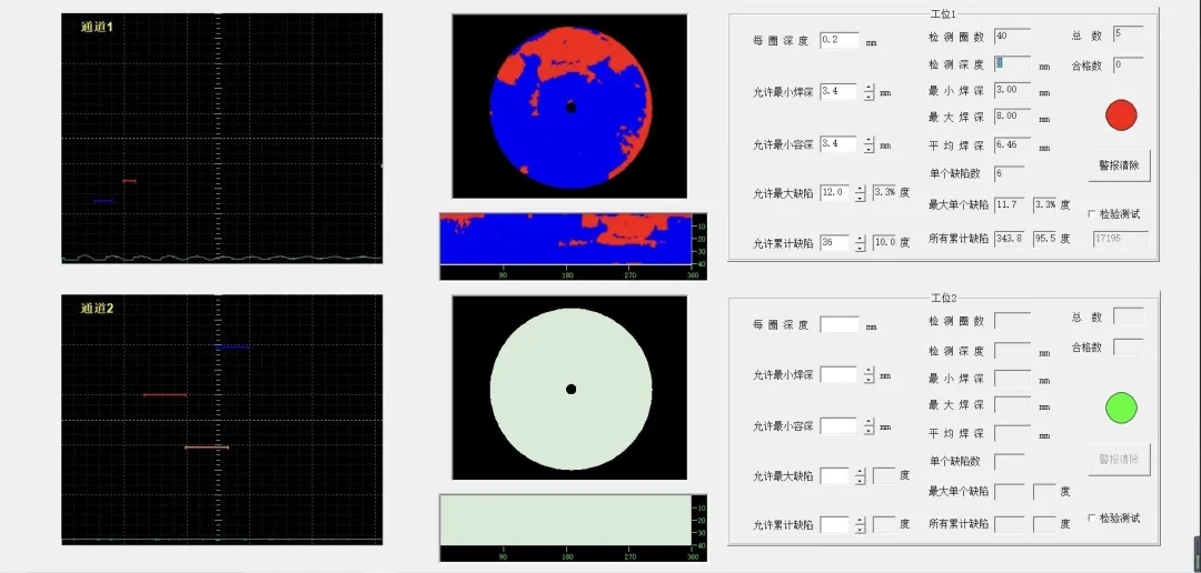 系統(tǒng)有兩個獨立的探傷通道,每一獨立檢測工位可單獨工作,兩個獨立的檢測工位可同時檢測不同的產(chǎn)品,系統(tǒng)分自動和手動,半自動三種操作模式??瑟毩⒒蛲瑫r打開兩個工位工作。