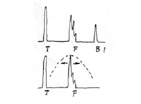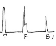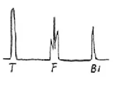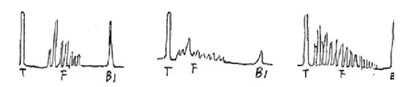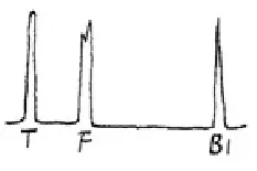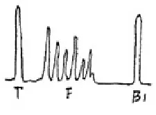軸類鍛件中的縱向內裂,直探頭圓周探傷,聲束平行于裂紋時,既無底波也無傷波,當探頭轉動90°時反射波最強,呈現(xiàn)裂紋波形,有時會出現(xiàn)裂紋的二次反射,一般無底波。底波與傷波出現(xiàn)特殊的變化規(guī)律(如圖)。
