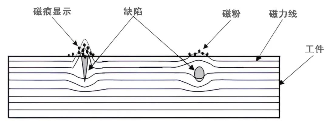磁粉探傷主要是對被檢測材料內部施加磁場使其磁化,然后在工件表面撒上磁粉觀察磁粉分布變化進而達到對材料缺陷分析判斷的方法。用于檢測鐵磁性工件表面或近表面間隙極窄的裂紋和目視難以看出的缺陷。