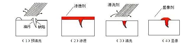 滲透檢測原理是基于液體的毛細現(xiàn)象,和固體染料在一定條件下的發(fā)光現(xiàn)象為基礎,進而進行對檢測工件表面缺陷分析判斷。在毛細作用下,經過一定時間,滲透劑可以滲入表面開口缺陷中;去除工件表面多余的滲透劑,經過干燥后,再在工件表面施涂吸附介質——顯像劑,在一定光源下(紫外線光或白光),缺陷處的滲透液痕跡被顯示(黃綠色熒光或鮮艷的紅色),從而探測出缺陷的形狀及分布狀況。滲透探傷有著色滲透和熒光滲透方法,廣泛應用于黑色和有色金屬鍛件、鑄件、焊接件、機加工件以及陶瓷、玻璃、塑料等表面缺陷的檢查。它能檢查出裂紋、冷隔、夾雜、疏松、折疊、氣孔等缺陷;但對于結構疏松的粉末冶金零件及其他多孔性材料不適用。